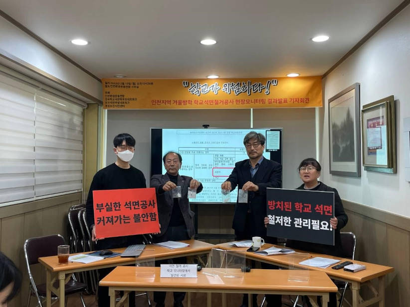 This photograph was taken at a February 13, 2023 press conference about illegal and unsafe asbestos removal activities at schools during the December 2022-February 2023 vacation. The event was held at the Incheon Friends of the Earth office. The words on the orange banner at the top of the picture say “Asbestos schools are dangerous”; the words on the poster with the red background say “concerns about unsafe asbestos removal”; the words on the black background say: “complete management for school asbestos.” Photo courtesy of BANKO.