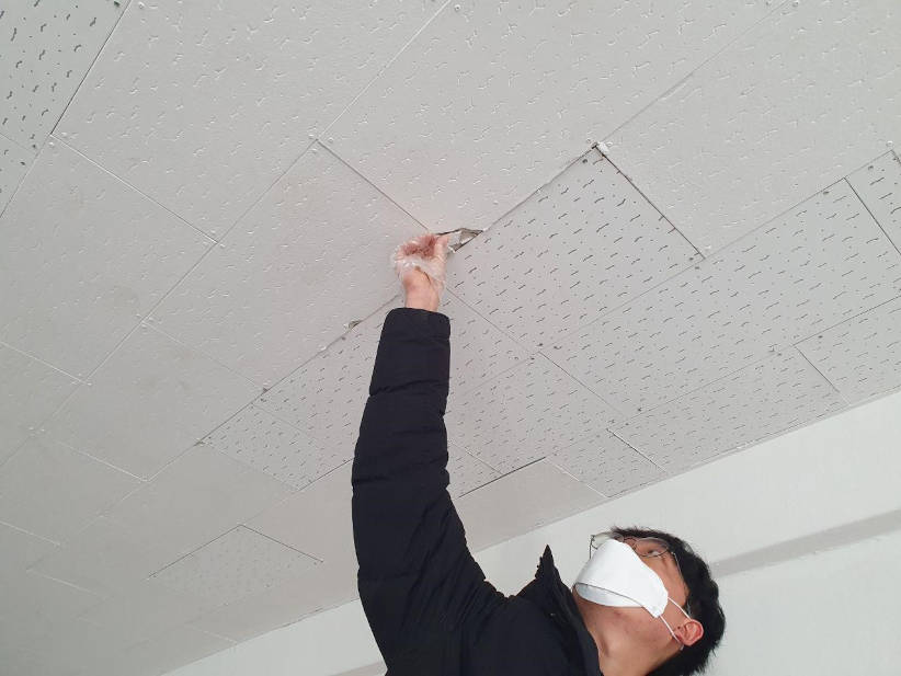 Bulk sampling of ceiling material in a schoolroom at a high school in Incheon, Korea February 8, 2023. The tests carried out by electron microscope showed that the tiles were in a fragile state and contained 4% chrysotile asbestos. Photograph by Yeyong Choi.